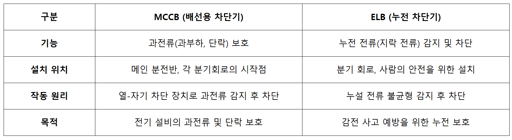 MCCB와 ELB는 각각 과전류 보호와 누전 보호라는 중요한 기능을 수행합니다.