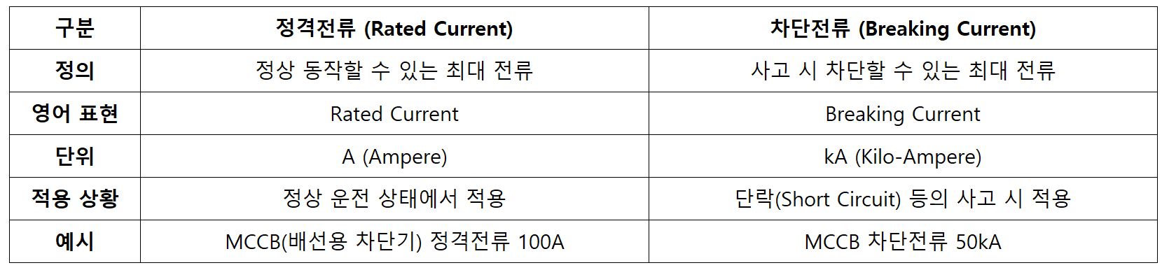 2. 정격전류와 차단전류의 차이 비교 테이블로 정리