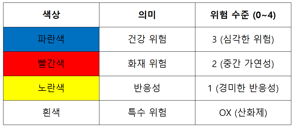 위 표는 특정 화학물질의 NFPA 지수를 나타내는 예시로, MSDS 문서에 포함되어 근로자와 응급 대응 팀이 빠르게 물질의 특성을 파악하는 데 도움을 줍니다.