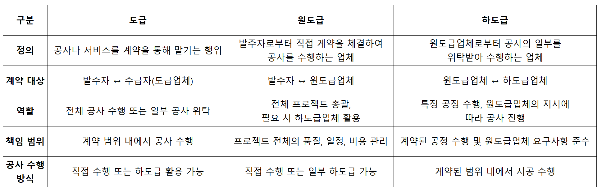 - 도급을 맡은 업체(수급자)는 계약된 공사를 수행하고, 발주자(원청사 또는 고객사)는 대금을 지급함