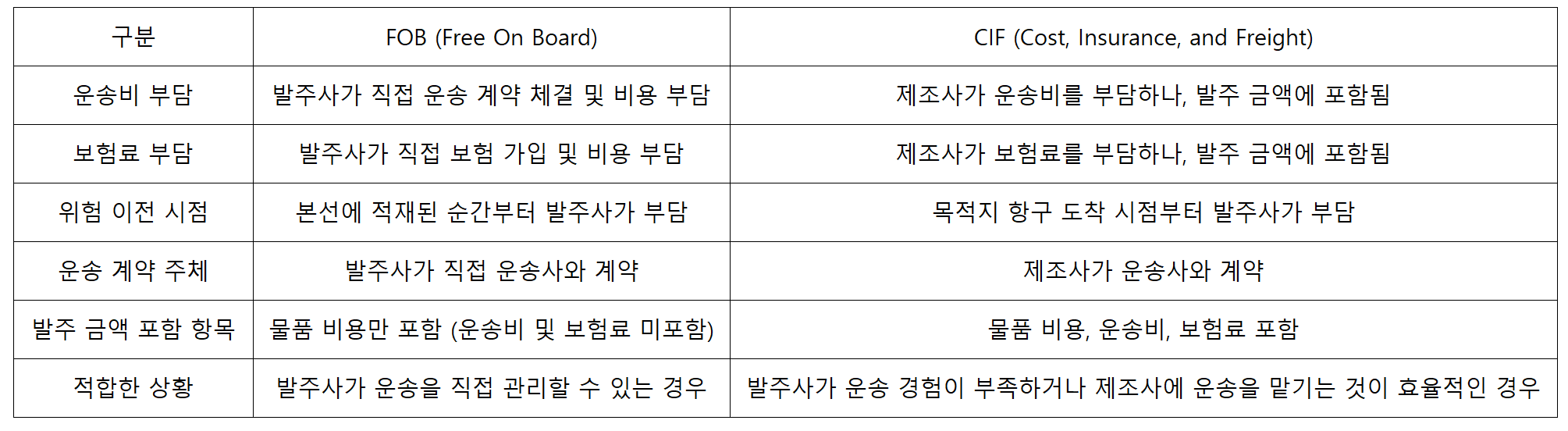 - CIF 조건에서는 제조사가 운송을 담당하므로 발주사가 운송 부담을 덜 수 있음