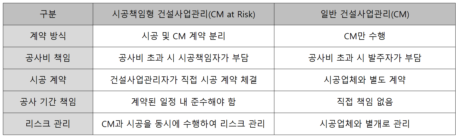 따라서, 프로젝트 특성에 따라 적절한 방식이 선택되어야 하며, 시공 및 CM을 수행할 수 있는 충분한 역량을 갖춘 건설사업자가 요구된다.