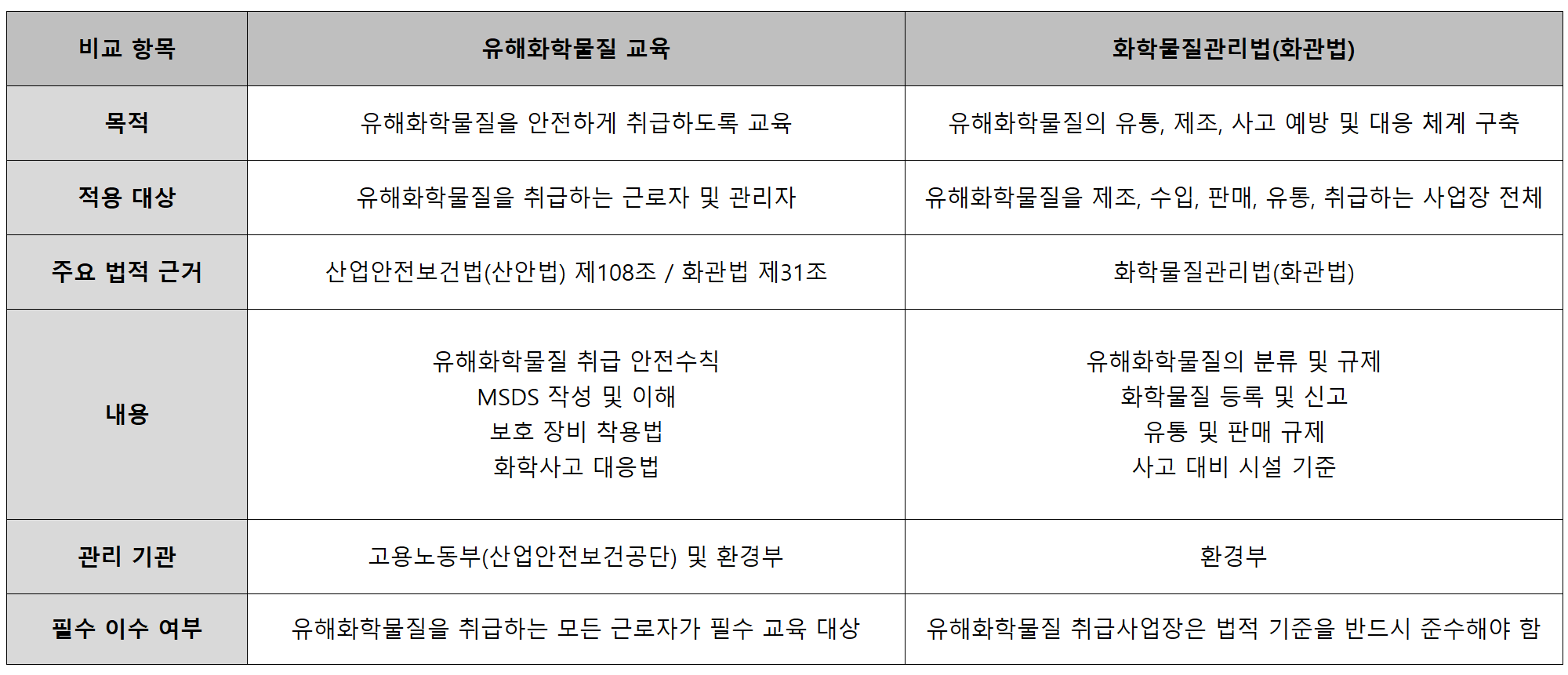 - 화학물질관리법(화관법) 제31조: 유해화학물질 취급 시 교육을 의무적으로 이수해야 함.