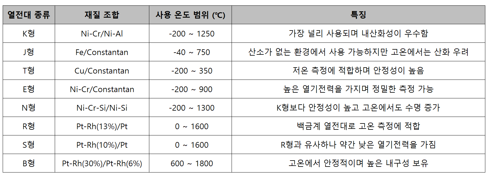- 이때, 두 금속 간의 온도 차이에 의해 열기전력(Seebeck 전압)이 발생하는데, 이를 이용하여 온도를 측정하는 센서가