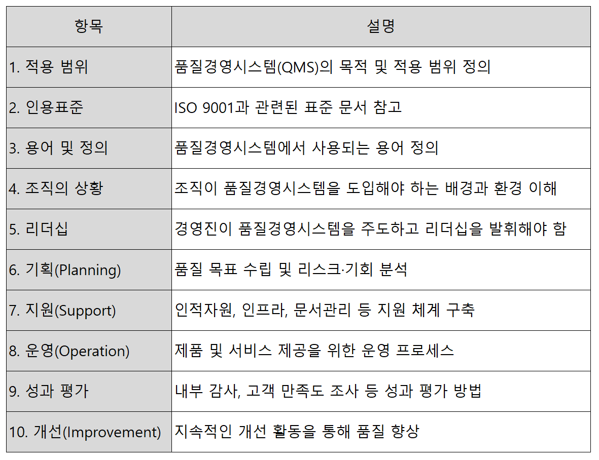 - 기업이 제품 및 서비스의 품질을 지속적으로 유지·개선하고, 고객 만족도를 향상시키기 위한 체계적인 경영 시스템을