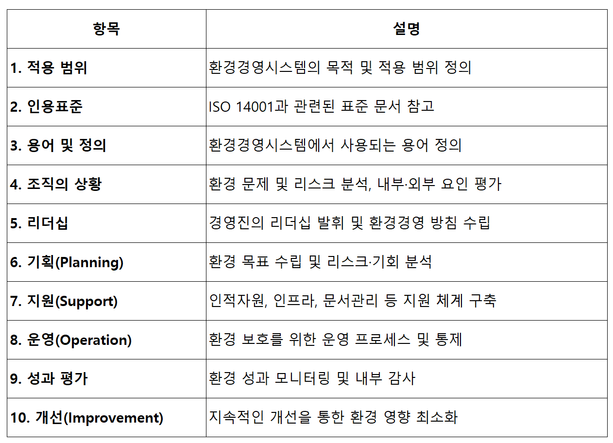 - 이 표준은 기업이 환경 영향을 최소화하고, 자원을 효율적으로 관리하며, 법적 규정을 준수하는 체계를 구축하도록