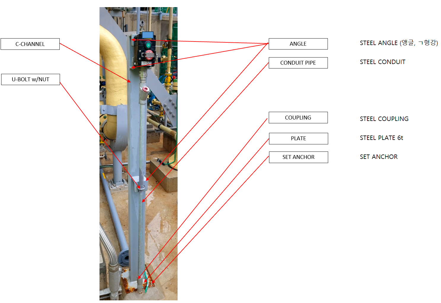 - PLATE, CONDUIT PIPE, ANGLE, COUPLING의 재질은 보통 STEEL을 사용합니다.