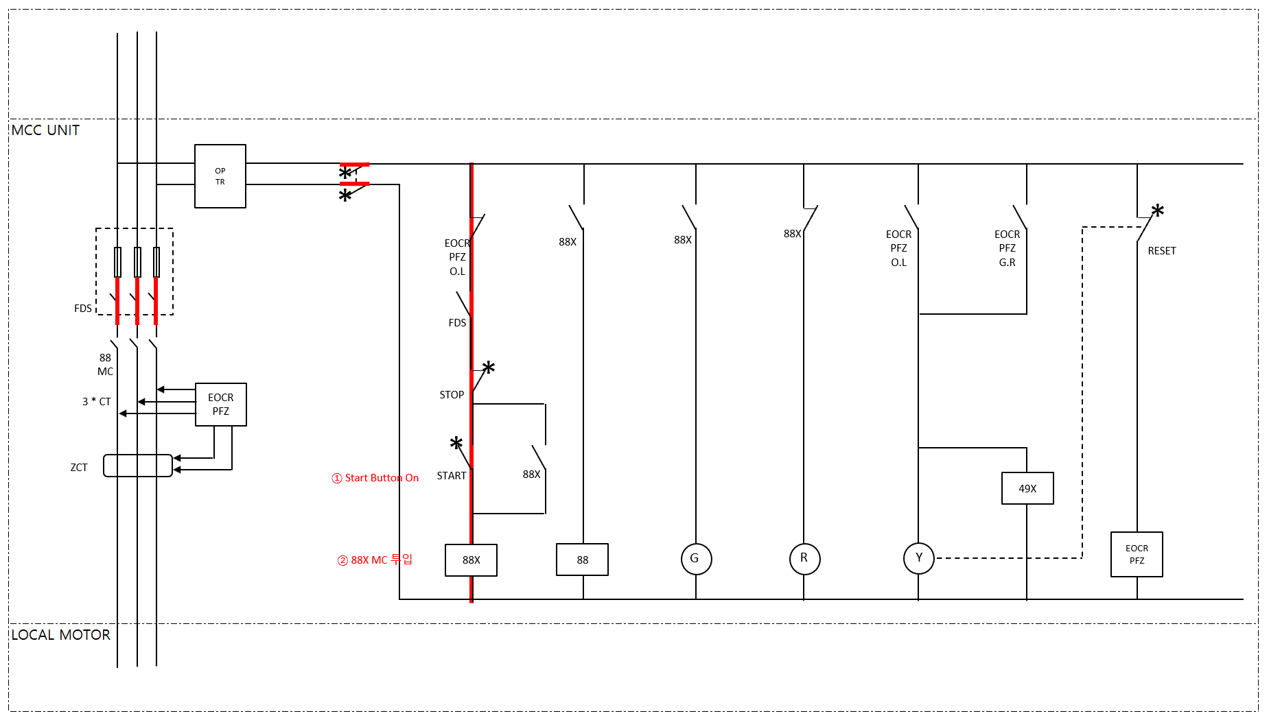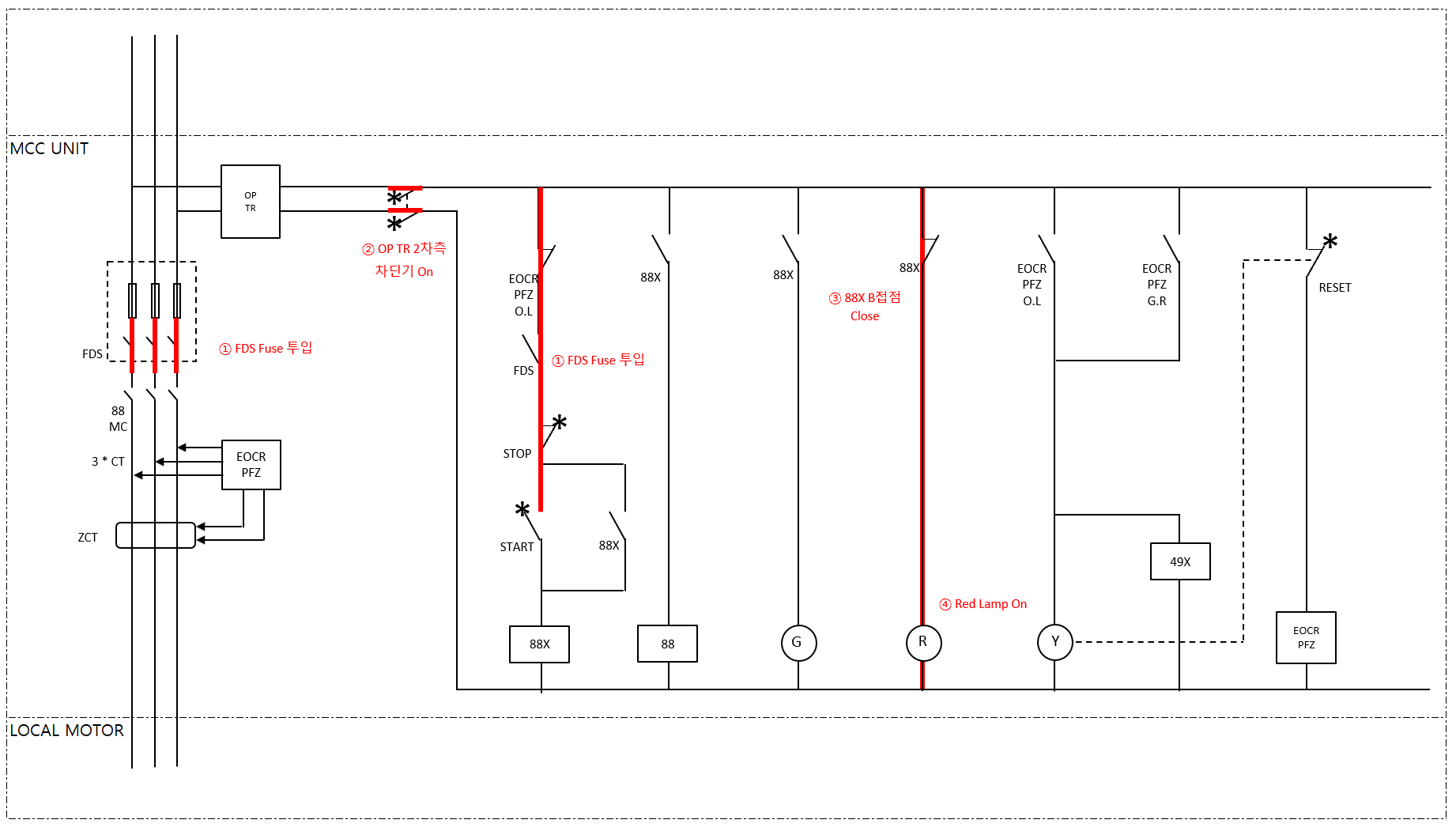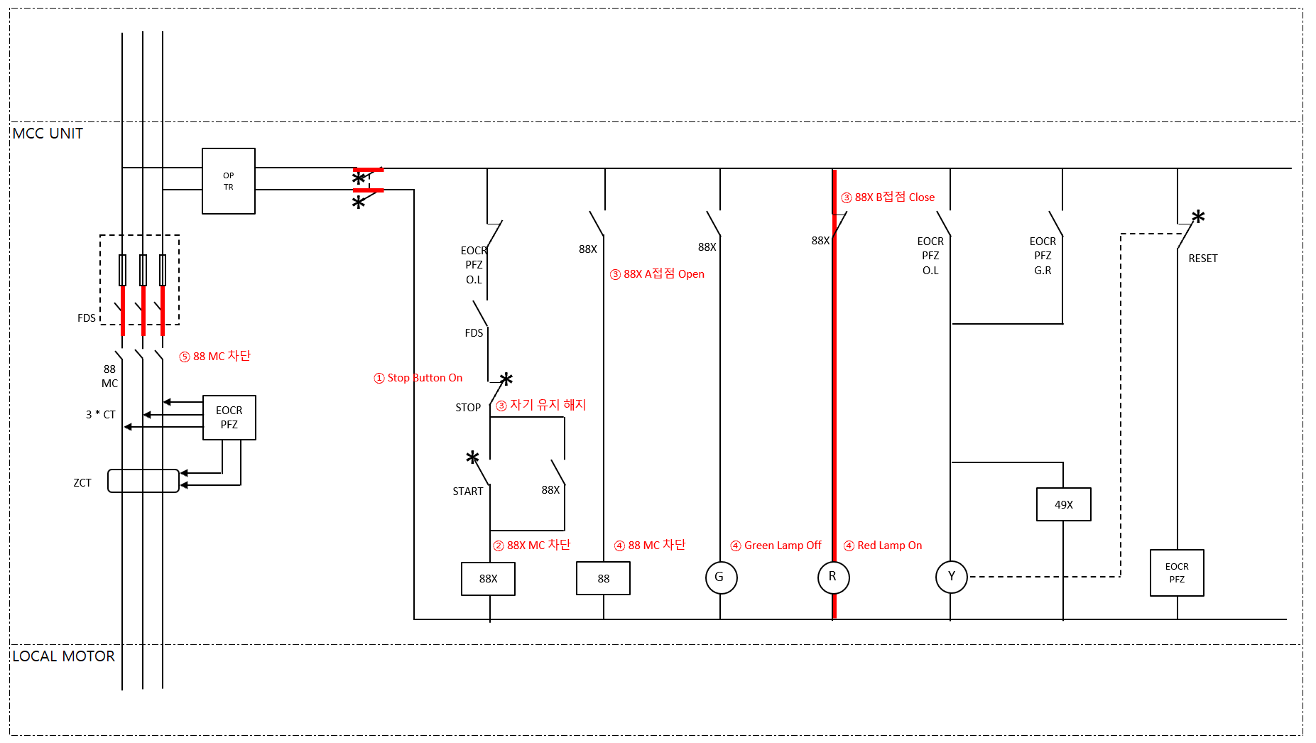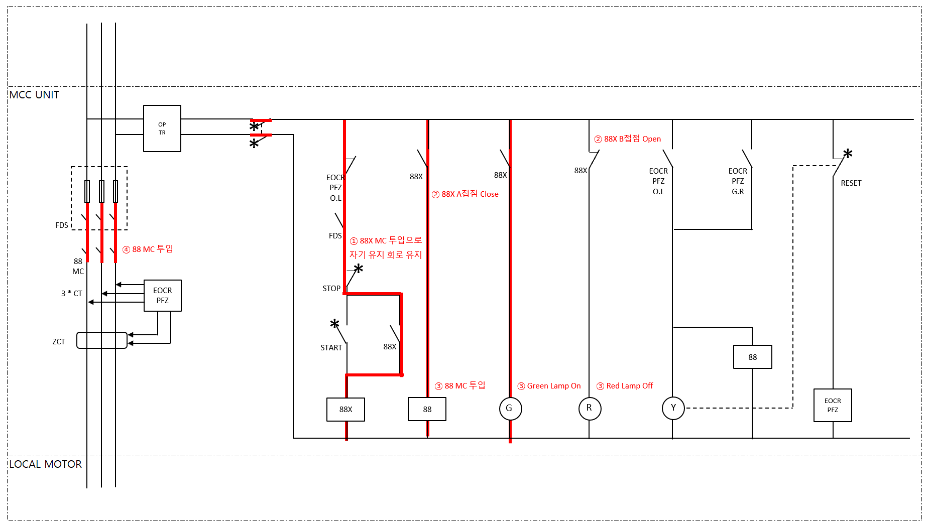 2. 88X B접점은 Close가 되어있어 통전이 되고 이로 인해 Red Lamp On