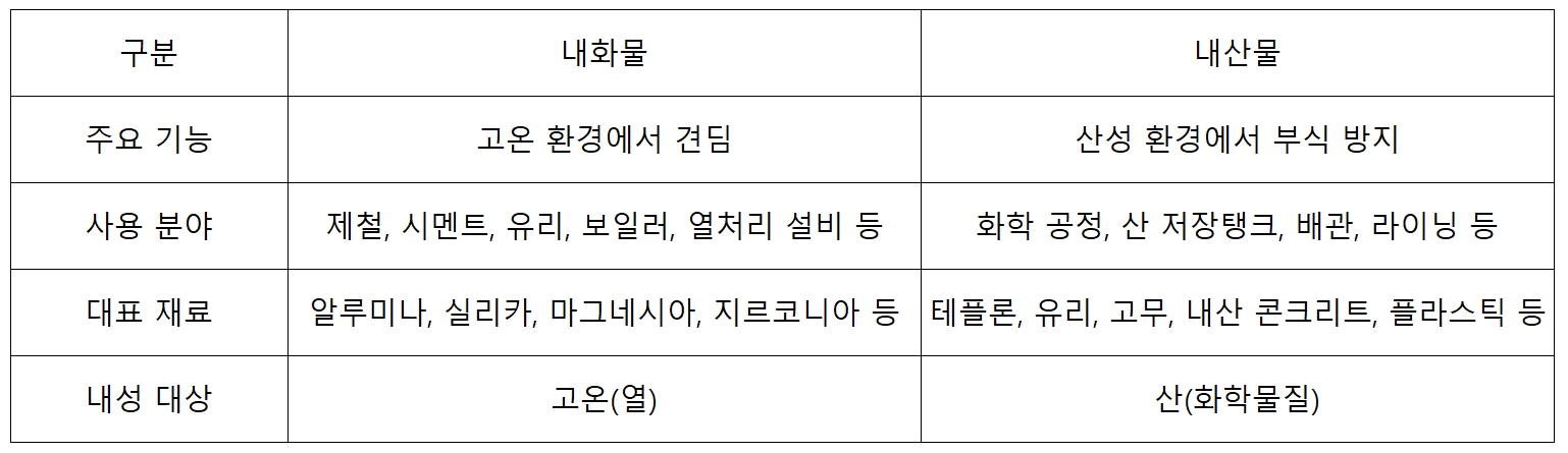 산업 현장에서 사용되는 재료 중에는 열이나 화학물질에 견디는 특수한 기능이 요구됩니다. 이런 조건에 맞춰 사용되는 재료 중 대표적인 것이 내화물(耐火物)과 내산물(耐酸物)입니다.