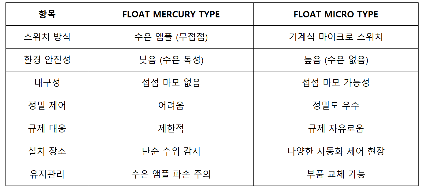 LEVEL SWITCH : FLOAT MERCURY TYPE vs FLOAT MICRO TYPE, 차이 설명