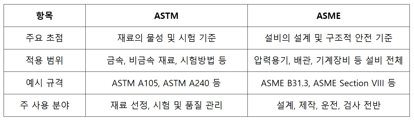 1) ASTM은 재료 중심의 품질 기준, ASME는 설비 중심의 안전 기준에 초점을 둔 표준 기관입니다.