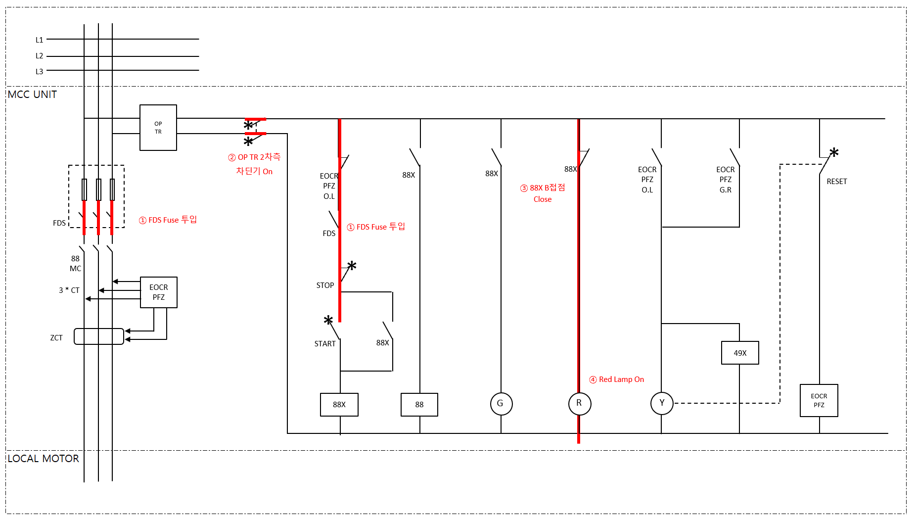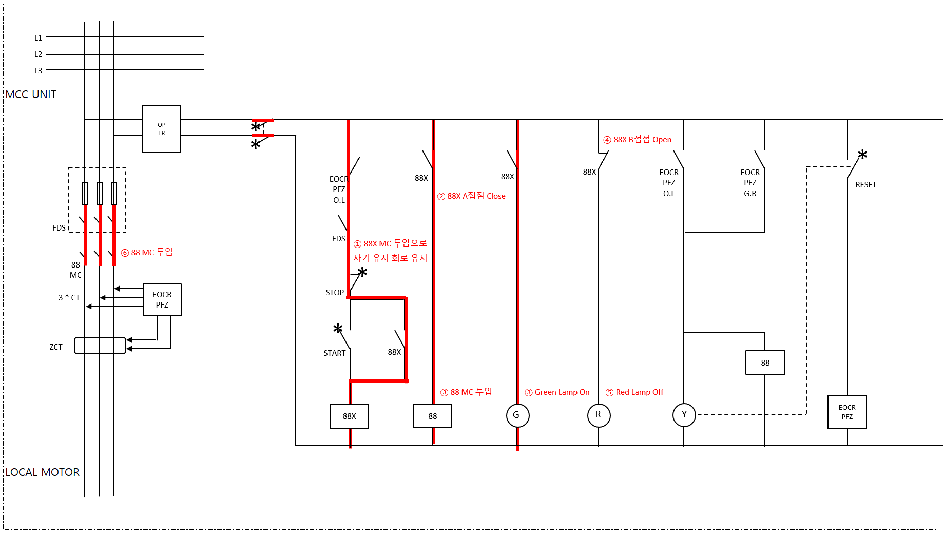 - 88X 투입 신호로 인해 ④ 88X B접점은 Open → Close가 되고 ⑤ Red Lamp Off 됨