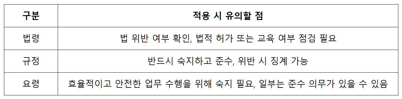 - 강제력: 일반적으로는 낮으나, 규정에서 요령의 준수를 명시하면 사실상 강제됨