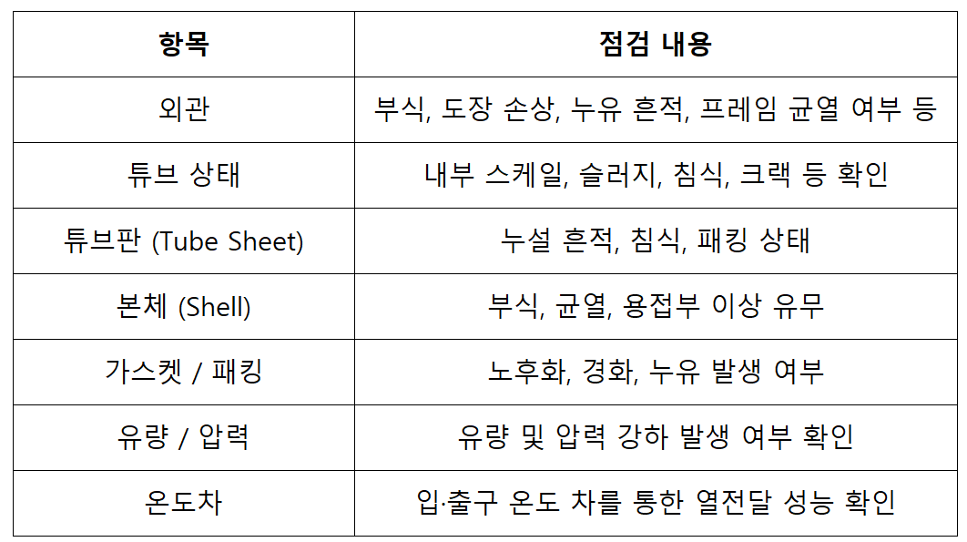 - 튜브 또는 셸 외벽 두께 측정하여 부식이나 마모 확인