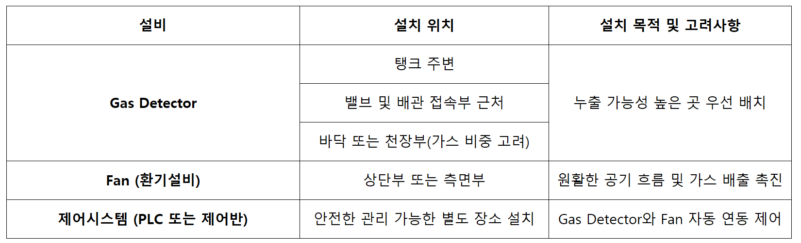 - 제어반 또는 PLC를 통해 Gas Detector와 Fan을 자동 연동 제어