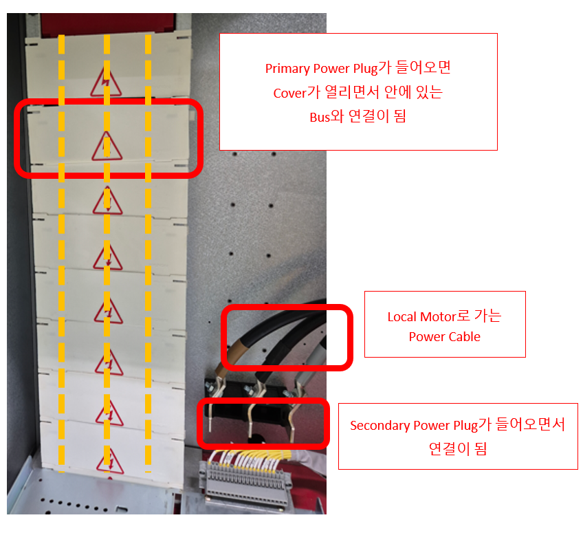 - Primary(1차) Power Plug : MCC PANEL에서 MCC Unit으로 전원을 공급.