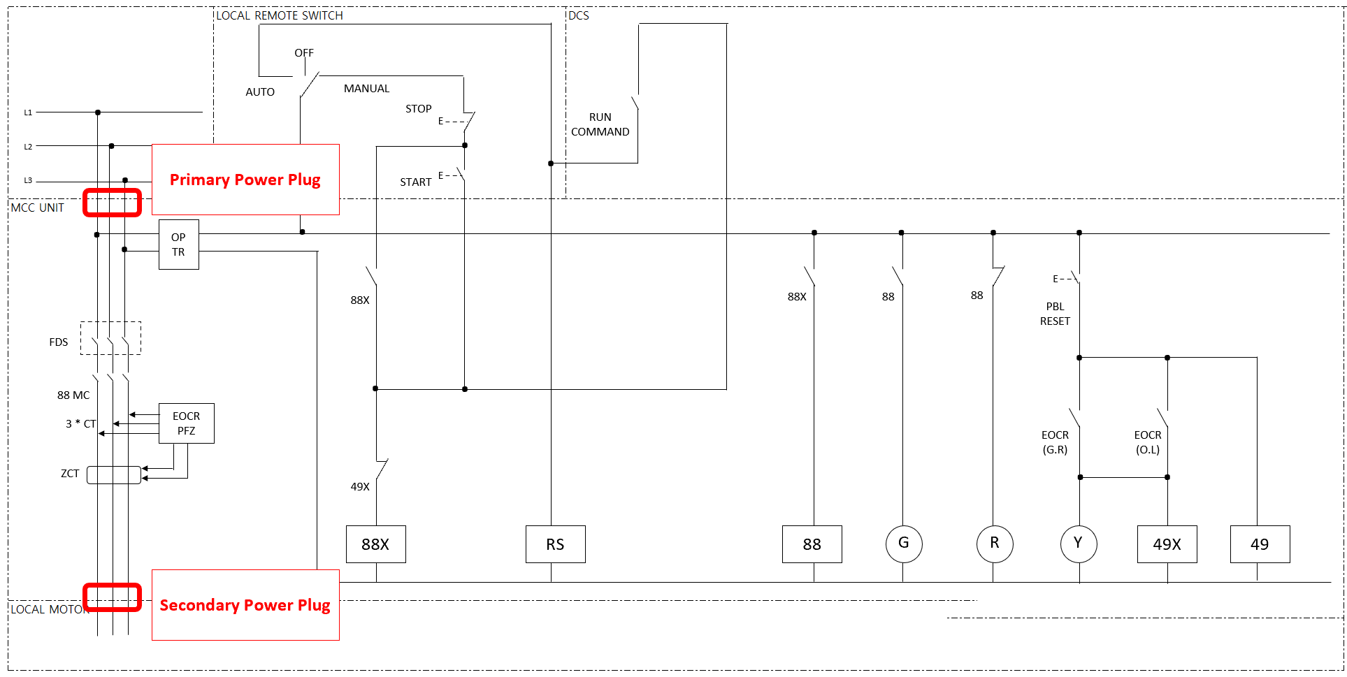 - Secondary(2차) Power Plug : MCC Unit 내 회로가 정상 작동 시 현장 모터로 전원을 공급.