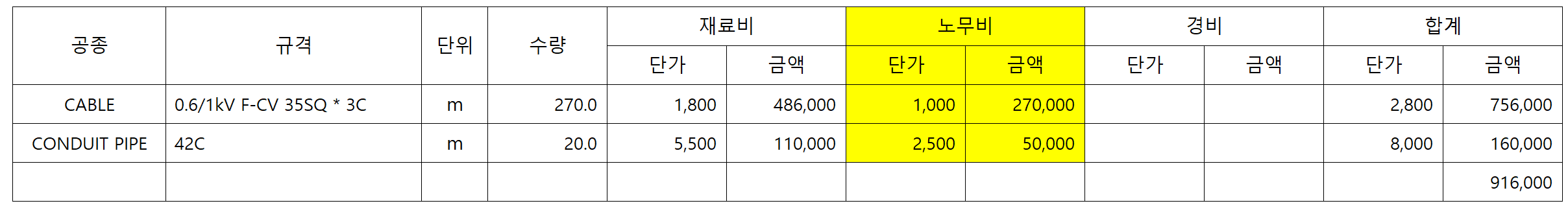 - 노무비 = 작업자 수 × 작업자 일당 × 작업 기간