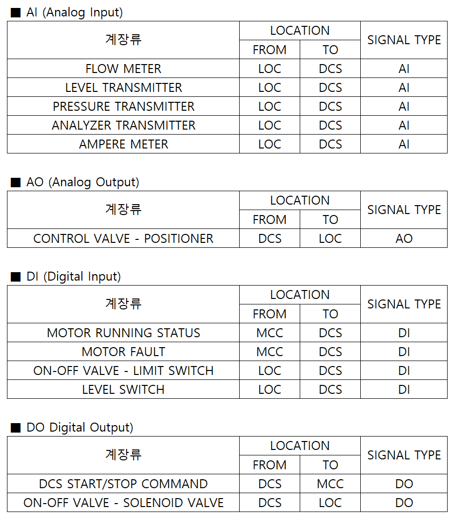 AI, AO, DI, DO 에 속한 계장류를 아래와 같이 정리했습니다.