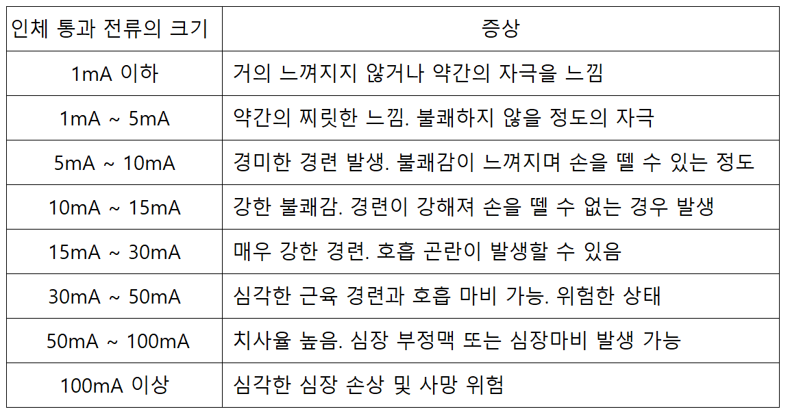 - 전류 강도와 인체 반응은 개인의 상태, 접촉 시간, 전류 경로에 따라 차이가 있을 수 있습니다.
